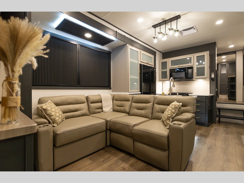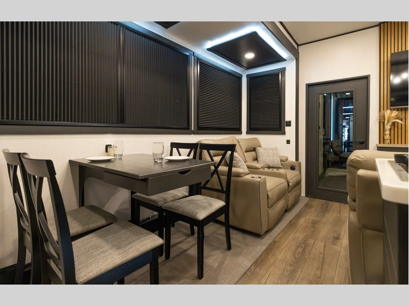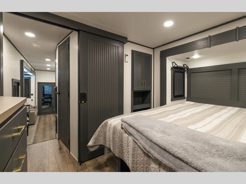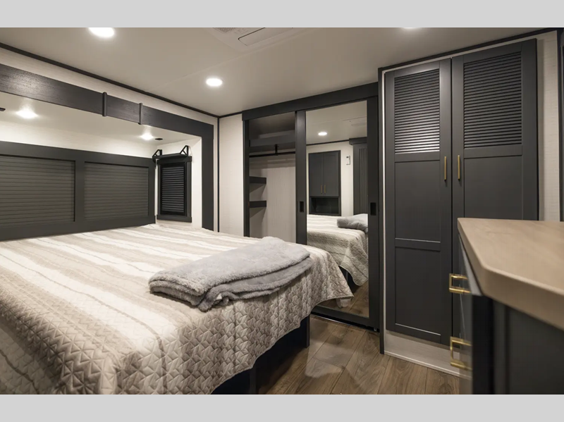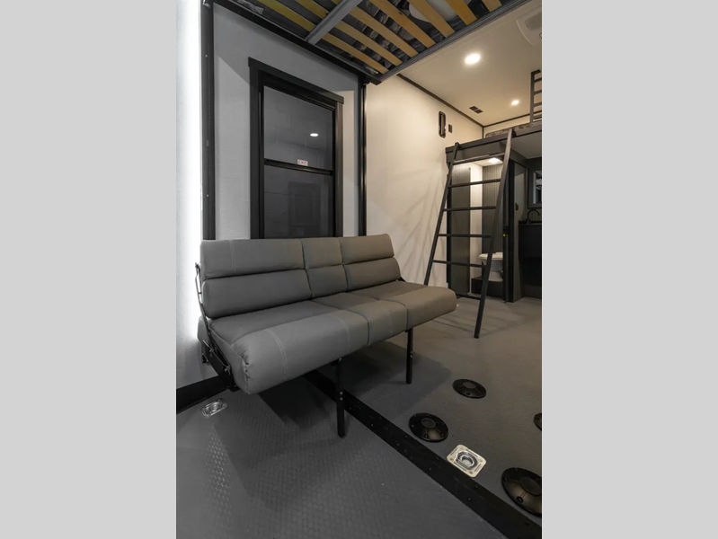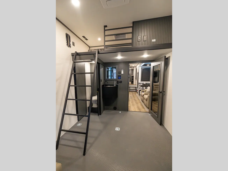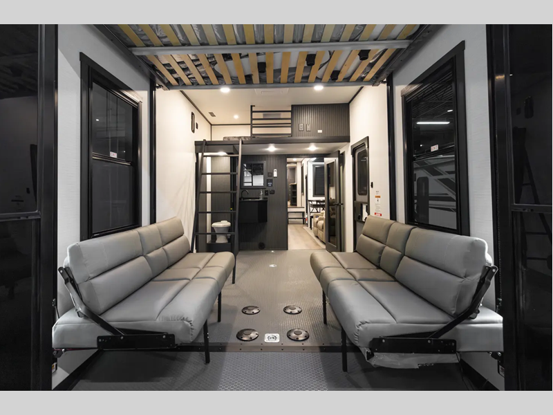 These toy haulers are 3/4 ton or 1 ton towable, and the additional height and width provides extra room for your toys to come along too. The MORryde CRE3000 suspension enhancement makes towing smooth and the Ground Control 3.0 auto electric leveling will have you set up at camp in no-time. The contemporary interior design will make your space feel a little more like home and the Congoleum stain-resistant vinyl flooring is perfect for a toy hauler with dirt, gas, and oil being brought in.