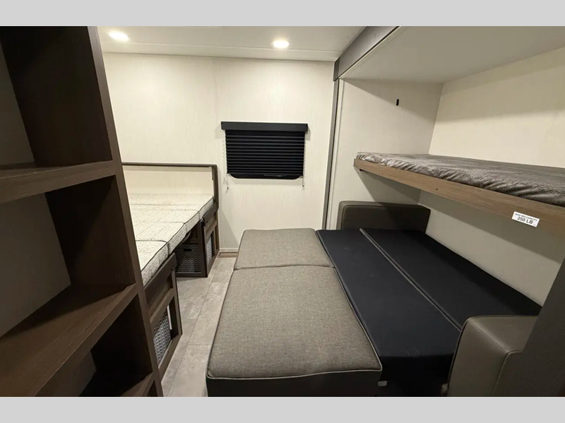 Sleeps 8 Slides 2 Length 34 ft 11 in Ext Width 8 ft Ext Height 10 ft 8 in Hitch Weight 780 lbs Dry Weight 6582 lbs Cargo Capacity 1198 lbs Fresh Water Capacity 42 gals Grey Water Capacity 34 gals Black Water Capacity 34 gals Furnace BTU 30000 btu Number Of Bunks 4 Available Beds Queen Refrigerator Type 12V Cooktop Burners 3 Number of Awnings 1 Water Heater Type Tankless AC BTU 15000 btu TV Info LR Smart TV Awning Info 19' Power w/LED Lighting Axle Count 2 Shower Type Standard Similar Floorplans